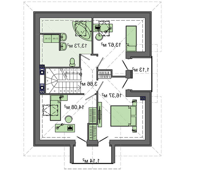 Мансарда отдана под уютную ночную зону. Ее основу составляют три спальные комнаты, в которых предусмотрены отдельные выходы на балконы. Комфортное пространство дополняет ванная комната общего пользования. Кстати, ее размеры позволяют здесь дополнительно оборудовать прачечную.