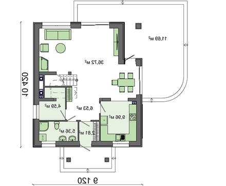 Благодаря сложной форме дневной зоны, выделены отдельные пространства. При этом целостность всего этажа сохраняется. Границей между ними служит лестница, ведущая в мансарду. Гостиная и столовая с отдельными выходами на просторную террасу, закрытая кухня создают единое светлое пространство. А угловая терраса зрительно расширяет дневную зону.