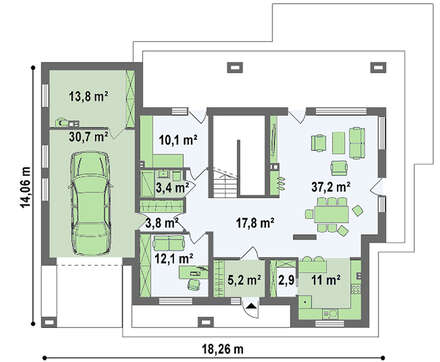 Семья из 4-6 человек вполне комфортно разместится в классическом двухэтажном доме с современными деталями. В проекте удачно сочетаются традиционные формы и современный комфорт.