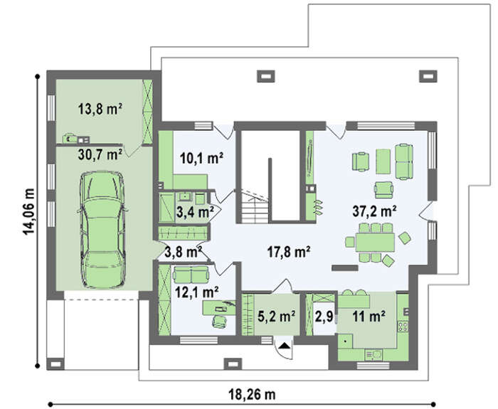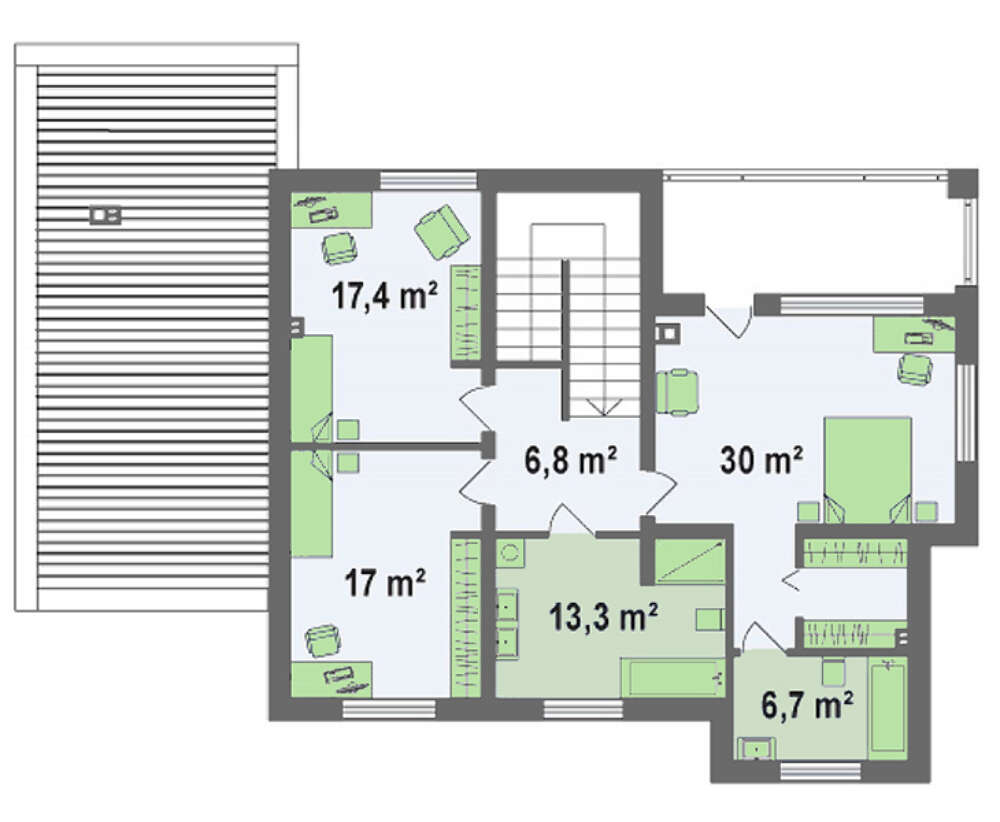 Семья из 4-6 человек вполне комфортно разместится в классическом двухэтажном доме с современными деталями. В проекте удачно сочетаются традиционные формы и современный комфорт.