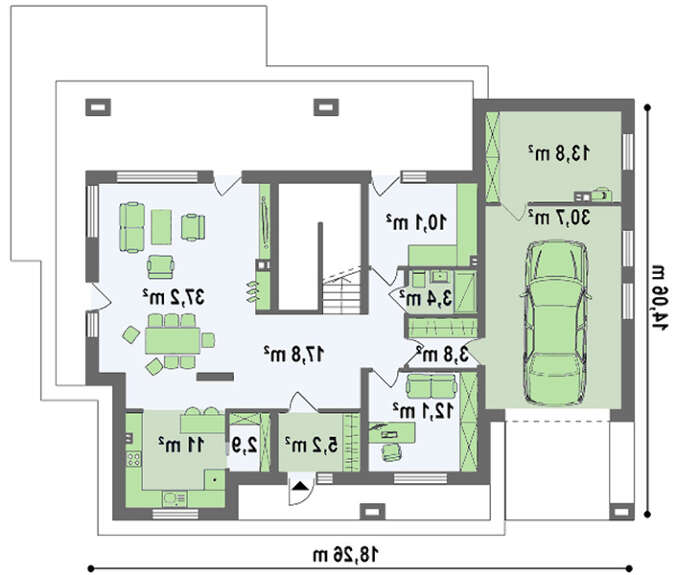 Работая над проектом двухэтажного дома в классическом стиле, архитекторы учли интересы всех членов семьи. Например, комнату на первом этаже можно использовать как спальню для пожилых людей. Тогда им не придется часто пользоваться лестницей для перехода с этажа на этаж. Здесь же расположена и уютная дневная зона, состоящая из гостиной, столовой и кухни с кладовой. А как дополнительное преимущество можно расценивать отдельную сауну на первом этаже.