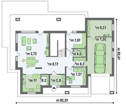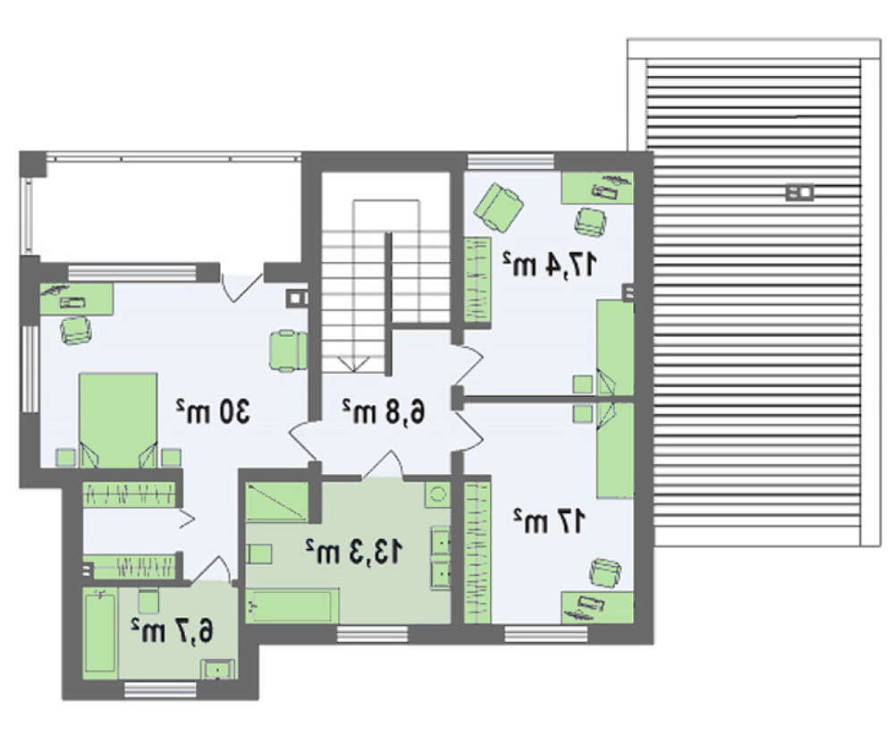 Семья из 4-6 человек вполне комфортно разместится в классическом двухэтажном доме с современными деталями. В проекте удачно сочетаются традиционные формы и современный комфорт.