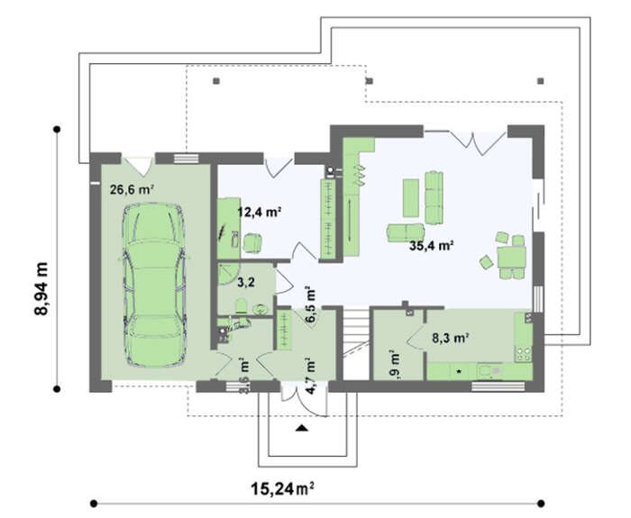 Проект содержит три раздела – АрхитектурныйКонструктивный и Инженерный: водоснабжение, отопление, вентиляция, канализация, электроснабжение (приобретается за дополнительную плату) + Пояснительная записка.