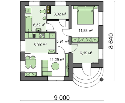 Внутреннее пространство рационально разделено между самыми необходимыми помещениями. Гостиная одновременно играет роль места для принятия пищи. Удачная расстановка мебели поделит комнату на две зоны: отдыха и столовой. Рядом расположена кухня в 7 кв. метров, которая оснащена современной техникой. Она позволит быстро и вкусно готовить и в считаные минуты накрывать стол.
