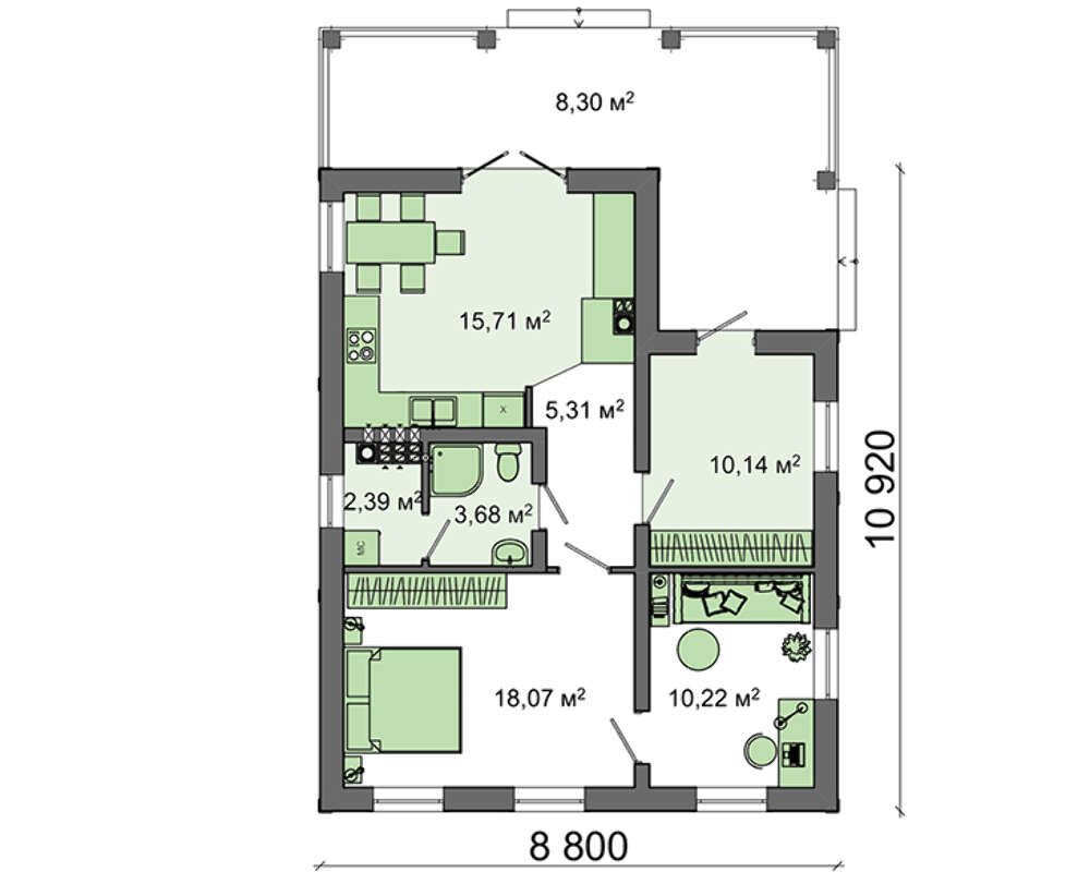 Компактные размеры позволяют максимально сэкономить территорию надела, отдав значительную ее часть под гараж, баньку, сад и огород. Но маленький снаружи, дом довольно вместительный внутри и содержит все необходимые для полноценного отдыха помещения. Детскую для подрастающего поколения в 10 кв. м. и спальню для взрослых в 18 кв. м. Кухню-студию с современным оборудованием, большим обеденным столом и мягкой мебелью. Помещение имеет выход на просторную террасу, которая в летнее время увеличит площадь гостиной. Здесь можно встречать гостей, готовить шашлык и загорать, нужно только оборудовать территорию садовой мебелью, мангалом и шезлонгами.