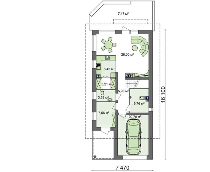 • 4M358 Проект коттеджа для узкого участка, с гаражом и террасой над ним
