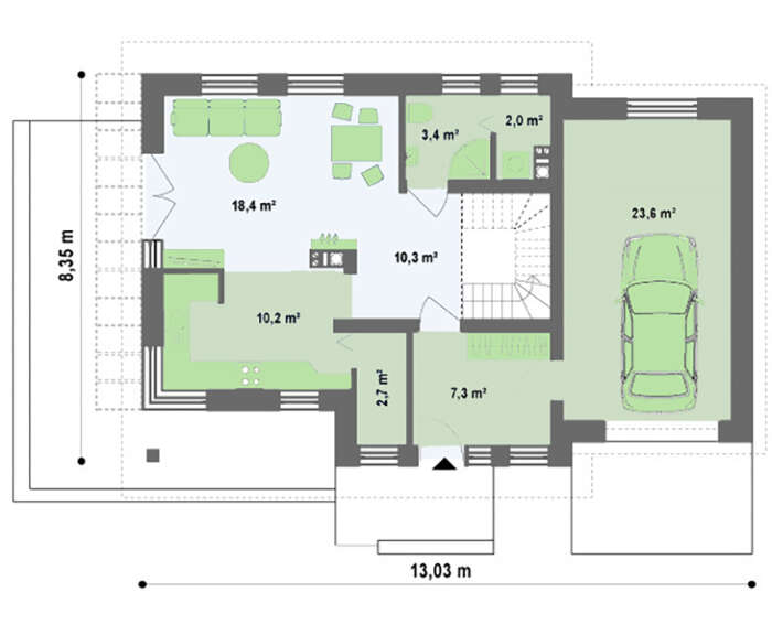 Проект коттеджа с гаражом, красивой мансардой и боковой террасой