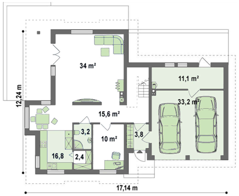 Проект коттеджа с интересными окнами и гаражом на два авто