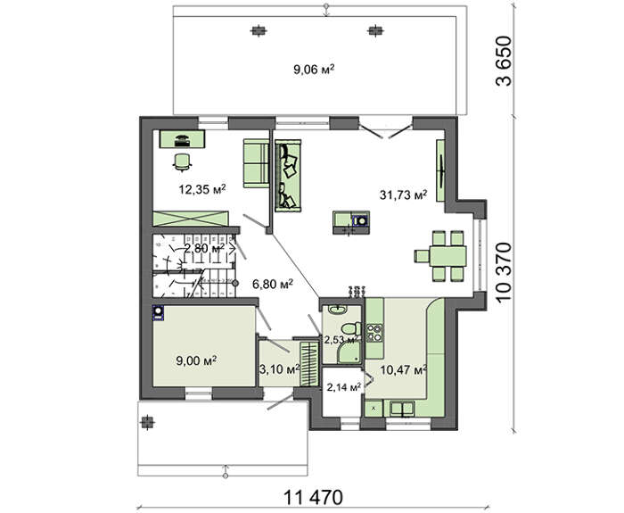 Проект содержит три раздела – Архитектурный, Конструктивный и Инженерный: водоснабжение, отопление, вентиляция, канализация, электроснабжение (приобретается за дополнительную плату) + Пояснительная записка.