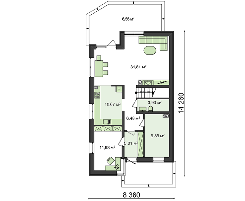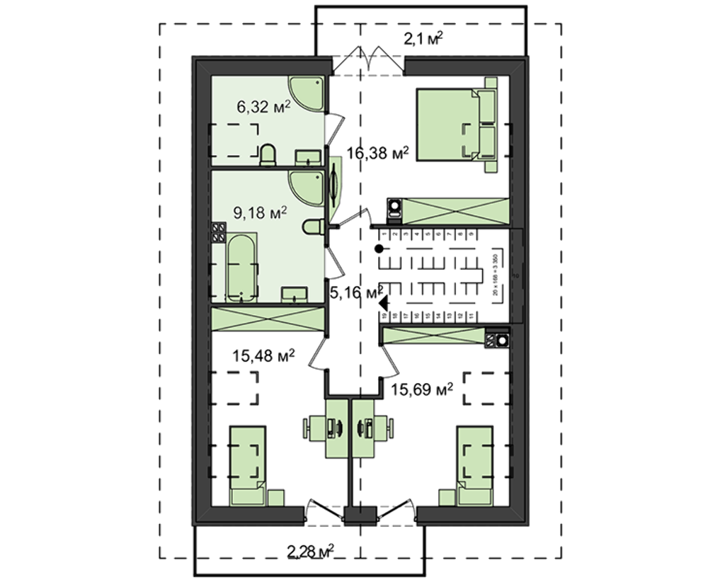 Проект содержит три раздела – Архитектурный, Конструктивный и Инженерный: водоснабжение, отопление, вентиляция, канализация, электроснабжение (приобретается за дополнительную плату) + Пояснительная записка.