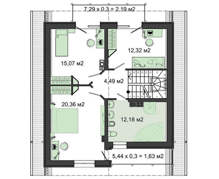 Проект содержит три раздела – АрхитектурныйКонструктивный и Инженерный: водоснабжение, отопление, вентиляция, канализация, электроснабжение (приобретается за дополнительную плату) + Пояснительная записка.