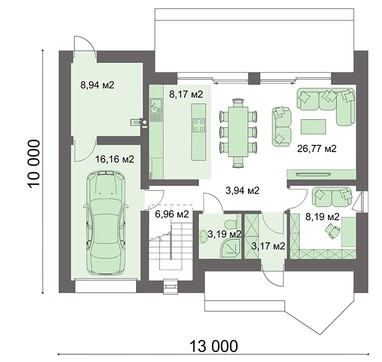 В проекте предусмотрены все необходимые для создания комфортных условий помещения. За счет общего пространства, студия — кухня приобрела значительные размеры. Предусмотрены гардеробы и просторные санузлы. Провести деловые переговоры или обсудить последние новости можно в небольшом отдельном помещении первого этажа. Размещенный под кровлей дома гараж, позволяет жильцам не волноваться о том, куда определить на ночь транспортное средство.