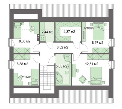 Несмотря на небольшие размеры, на втором этаже запланировано четыре спальни. Просторные гардероб и санитарное помещение, прачечная делают жизнь проще и удобнее.