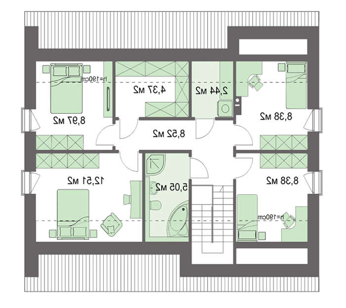 Несмотря на небольшие размеры, на втором этаже запланировано четыре спальни. Просторные гардероб и санитарное помещение, прачечная делают жизнь проще и удобнее.