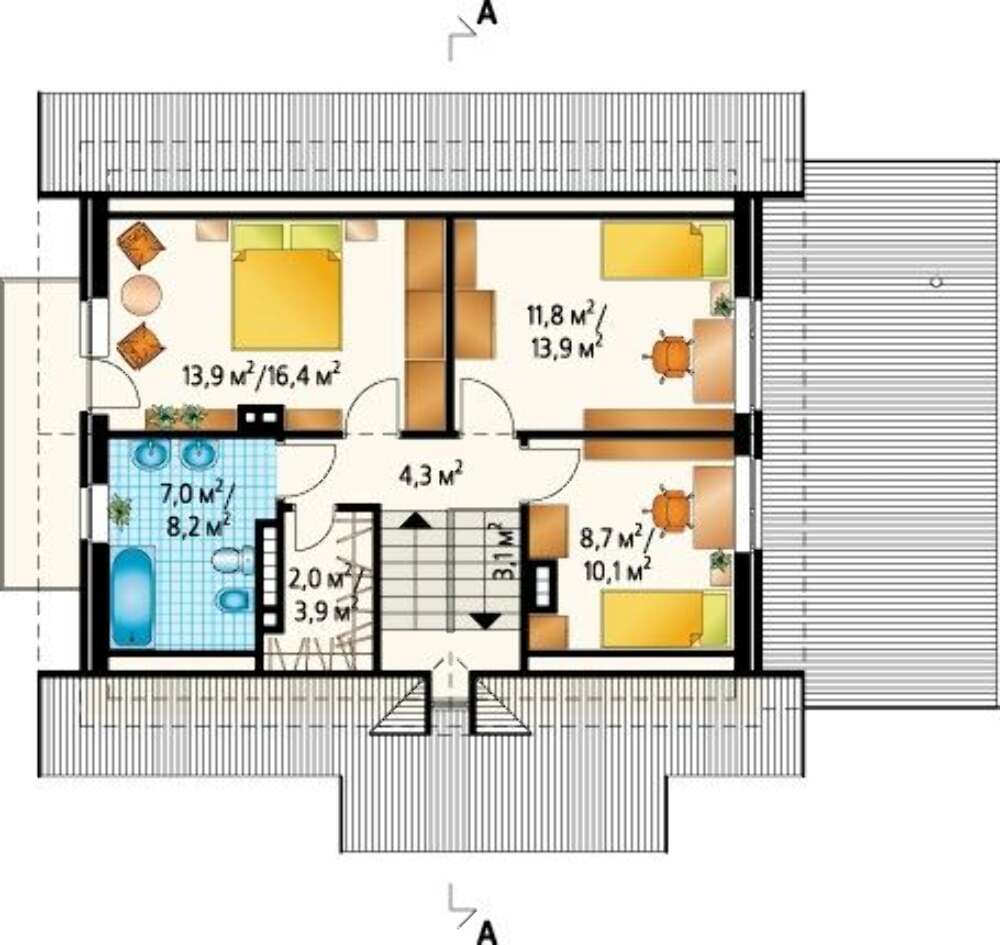 Четыре индивидуальных помещения рассчитаны на обеспечение комфортного отдыха. Первый этаж — зона старшего поколения или кабинет для деловых встреч. Из трех комнат верхнего уровня наиболее интересной покажется с балконом, который наполняет личное время новыми свежими эмоциями и сюжетами.
