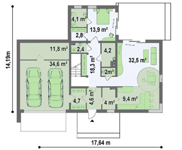 Проект коттеджа в стиле модерн с гаражом для двух авто