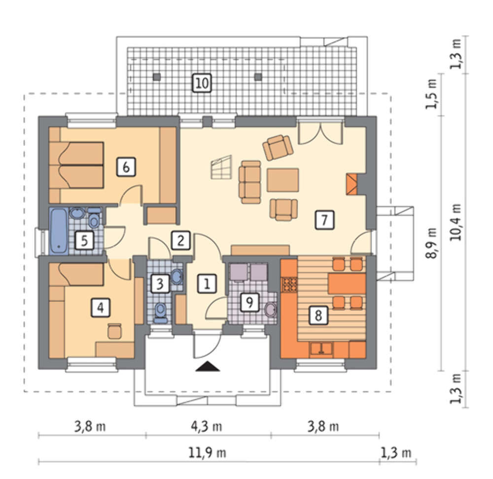 Проект содержит три раздела – АрхитектурныйКонструктивный и Инженерный: водоснабжение, отопление, вентиляция, канализация, электроснабжение (приобретается за дополнительную плату) + Пояснительная записка.