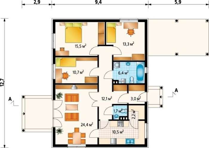Проект красивого коттеджа с пристроенным навесом для автомобиля