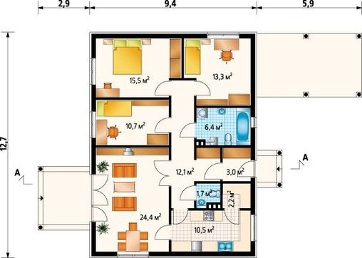 Проект содержит три раздела – АрхитектурныйКонструктивный и Инженерный: водоснабжение, отопление, вентиляция, канализация, электроснабжение (приобретается за дополнительную плату) + Пояснительная записка.
