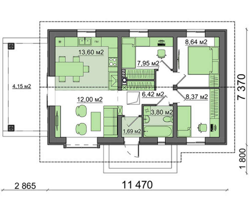 Дом спроектирован предельно рационально. За счет минимизации транзитных зон и хозяйственных помещений, расширены три спальных комнаты. Кстати, уменьшение транзитных зон создает дополнительный комфорт и облегчает доступ в любое помещение. Но, несмотря на компактность ванной комнаты, в ней спокойно поместится вся сантехника и даже современная стиральная машина.