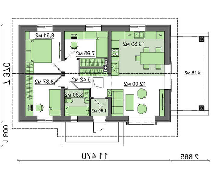 Дом спроектирован предельно рационально. За счет минимизации транзитных зон и хозяйственных помещений, расширены три спальных комнаты. Кстати, уменьшение транзитных зон создает дополнительный комфорт и облегчает доступ в любое помещение. Но, несмотря на компактность ванной комнаты, в ней спокойно поместится вся сантехника и даже современная стиральная машина.