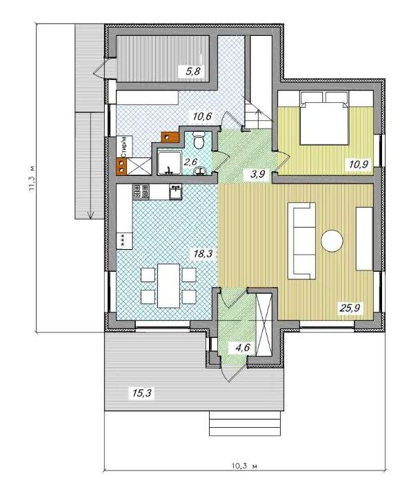 Проект содержит три раздела – АрхитектурныйКонструктивный и Инженерный: водоснабжение, отопление, вентиляция, канализация, электроснабжение (приобретается за дополнительную плату) + Пояснительная записка.