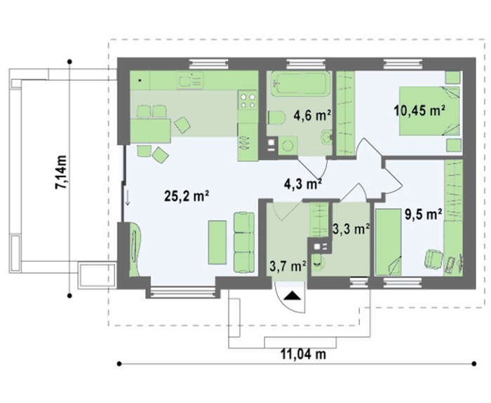 Проект небольшого классического одноэтажного дома – это еще один вариант разработки 4M053. Его отличие в том, что спальных комнат только две, поэтому их площадь увеличена. А также добавилась котельная.
