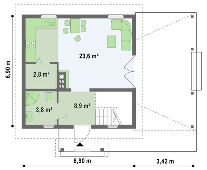 Первый этаж домика у озера - это зона отдыха с выходом на террасу, удобная кухонька, и небольшой совмещенный санузел. Все это поместилось в компактном квадратном помещении размером 6,9х6,9 м. Второй этаж – это мансарда, где разместились спальни. Любая семья оценит такой домик и его уют. Здесь масса возможностей для творчества и отдыха, для занятий спортом и просто подвижных игр. Можно завтракать на террасе и устраивать пикники у воды. Небольшой причал – обязательный атрибут на берегу рядом с домом. Он нужен не только для лодки, но еще и для того, что бы прыгать с него в воду. Здесь рождаются новые идеи и гениальные мысли.