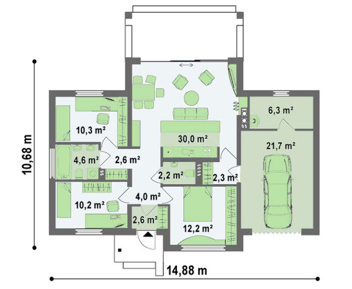 Учитывая компактность одноэтажного дома, проектировщики сделали все, чтобы жилище стало предельно комфортным и функциональным. В проекте отлично сочетаются интересный дизайн внутреннего пространства и внешняя привлекательность строения. Такой дом станет уютным жилищем для небольшой семьи.