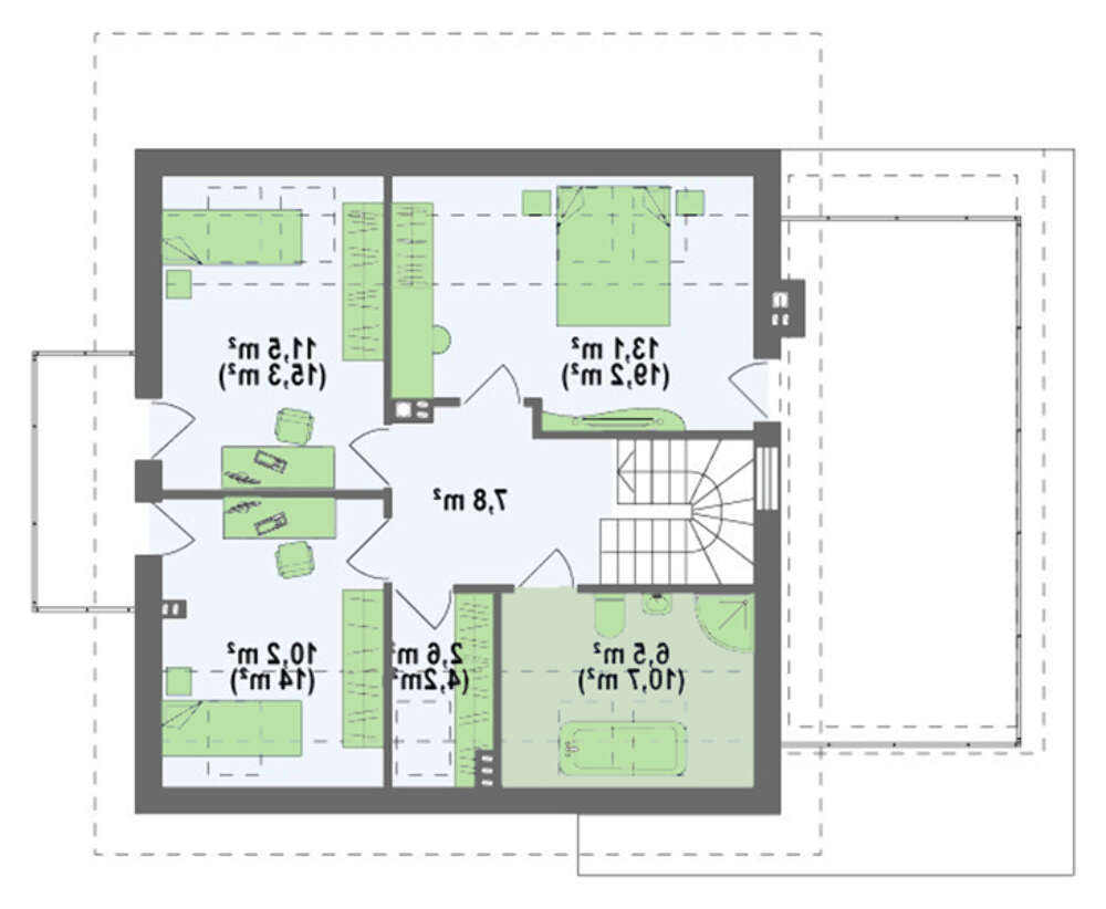 Удачное свое сочетание серый цвет нашел в доме 4M232. Серые окна, серые двери, серая крыша и даже гараж серый. Но дом от этого не стал скучным и «серым». Напротив, он очень нарядный и позитивный, изысканный и грациозный. Не такой уж и мрачный этот серый цвет, как о нем говорят.