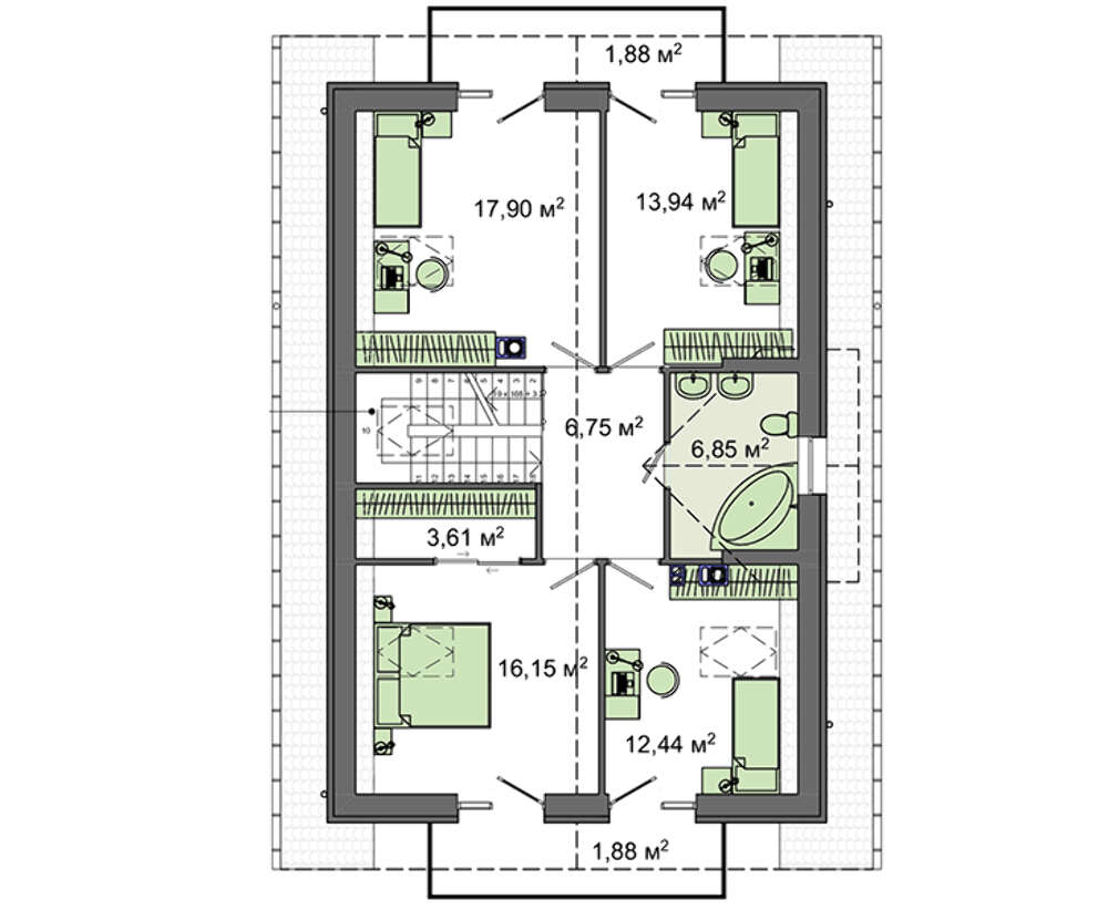 Рациональное размещение четырех спальных горниц на втором этаже помогает хорошему расслаблению. Большие размеры комнат позволяют поместить всю требуемую для отдыха мебель. Разнесение палат на противоположные стороны поможет молодежи и старшему поколению не докучать друг другу.