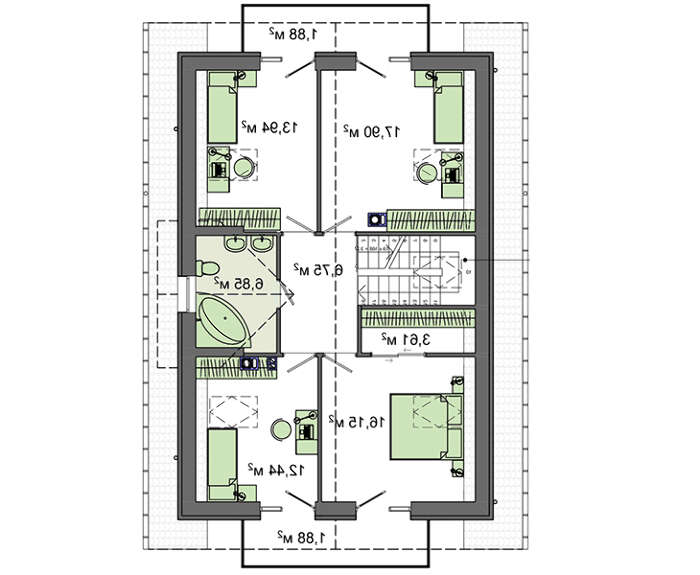 Рациональное размещение четырех спальных горниц на втором этаже помогает хорошему расслаблению. Большие размеры комнат позволяют поместить всю требуемую для отдыха мебель. Разнесение палат на противоположные стороны поможет молодежи и старшему поколению не докучать друг другу.