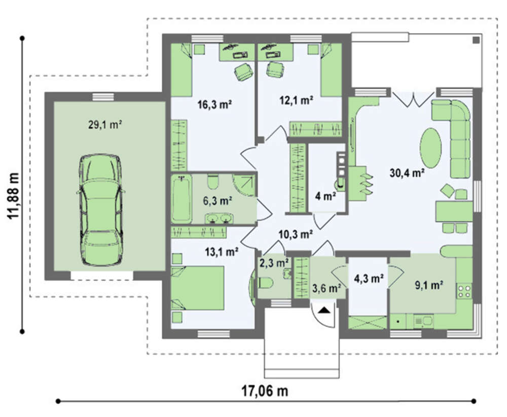 Проект одноэтажного дачного классического коттеджа с четырехскатной крышей
