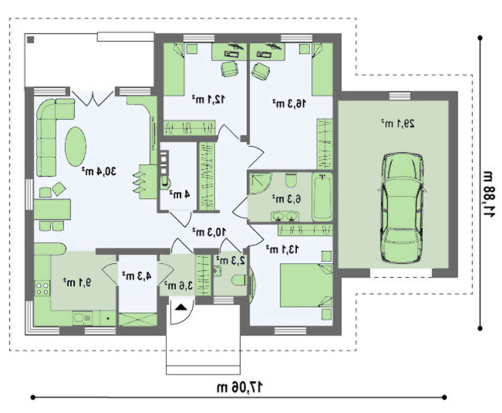 Проект одноэтажного дачного классического коттеджа с четырехскатной крышей