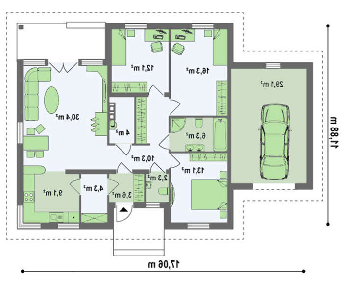 Проект одноэтажного дачного классического коттеджа с четырехскатной крышей 4M250G