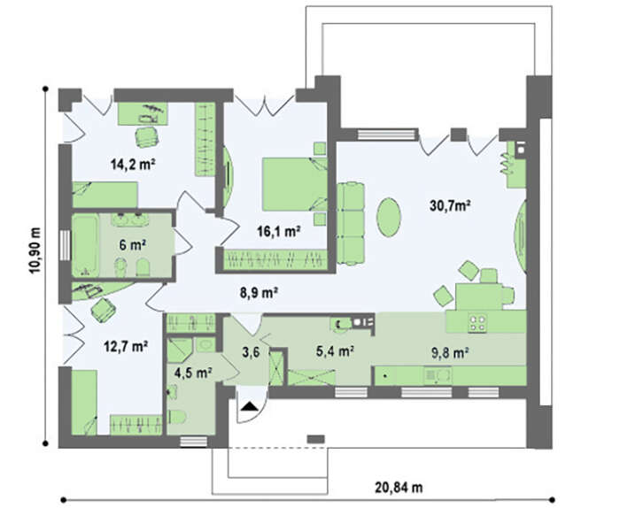 Проект содержит три раздела – Архитектурный, Конструктивный и Инженерный: водоснабжение, отопление, вентиляция, канализация, электроснабжение (приобретается за дополнительную плату) + Пояснительная записка.