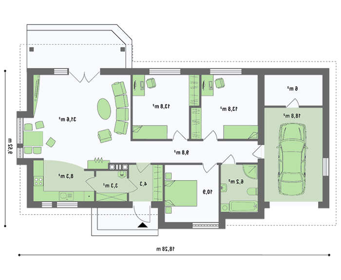 • 4M7057 Проект одноэтажного дома площадью 121 кв.м.с гаражом на 1 авто