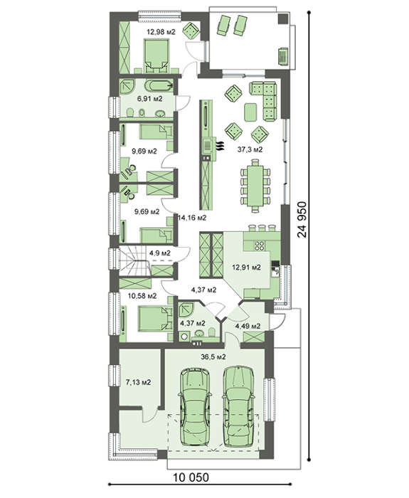 Торцевая часть полностью отдана под гараж. Рассчитанный на две машины, он имеет достаточно места для хранения инструмента, приспособлений и выполнения работ по обслуживанию техники. Три спальных помещения практически не отличаются по габаритам. Большие размеры четвертой комнаты и собственный выход на веранду делают спальню более функциональной.