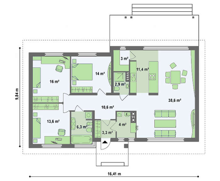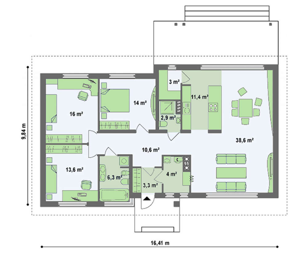 Казалось бы, куда уж традиционнее: дом четко разделен на дневную и ночную зоны. Слева – три спальни и ванная, совмещенная с прачечной, справа расположены гостиная, столовая и кухня. Но здесь и начинаются неожиданности. Гостиная расположена около входа. А это позволяет построить дом на участке с южным заездом. Кухня в стиле "остров" совмещена со столовой. Из этой функциональной подзоны есть выход на открытую террасу. Просто идеальная "барбекю-территория".