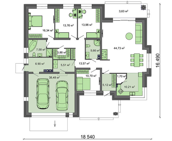 • 4M1504 Проект одноэтажного дома с гаражом для 2 авто площадью 201 кв.м.
