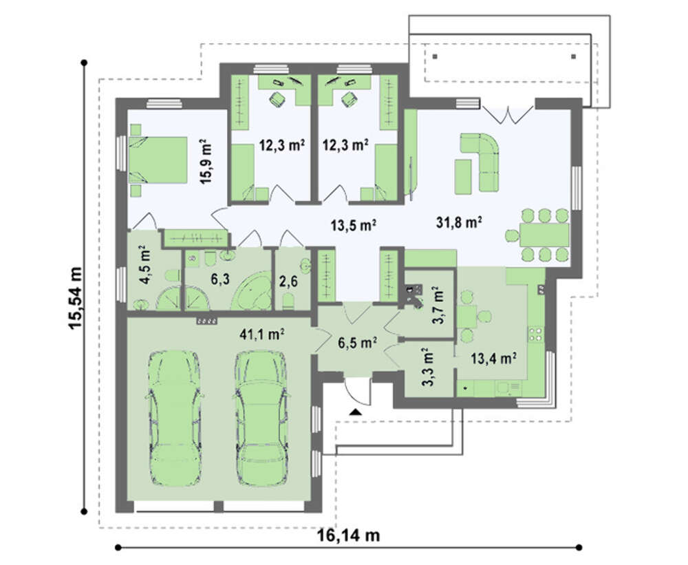 Застройщикам, которые считают, что жилье, прежде всего, должно быть практичным, предлагаем рассмотреть проект одноэтажного дома с гаражом для двух авто.