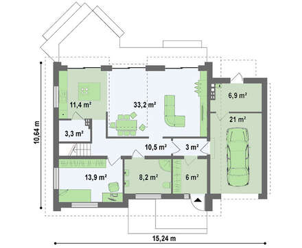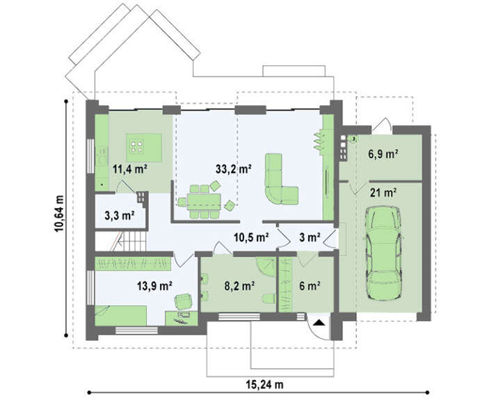 Проект одноэтажного коттеджа с мансардой и большим фронтальным окном в гостиной