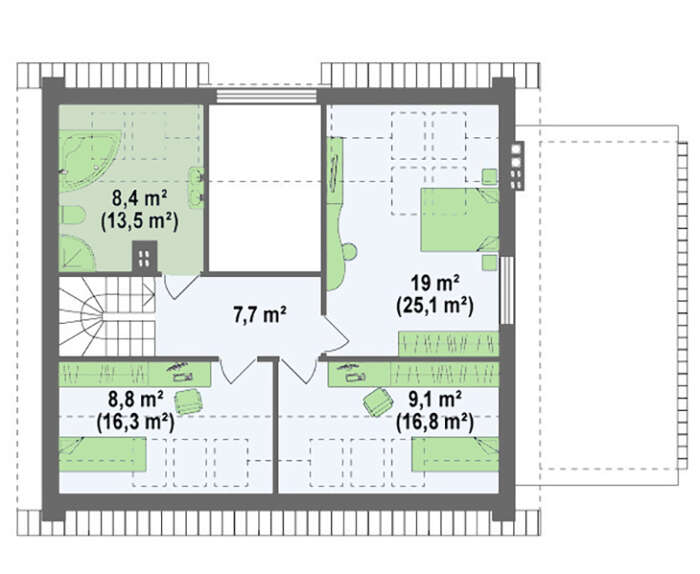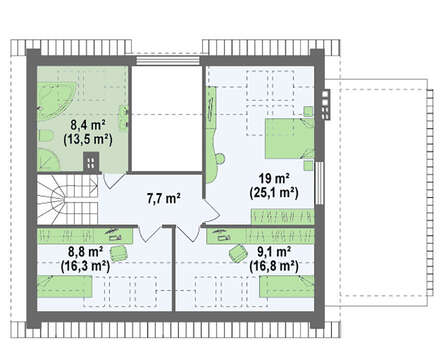 • 4M300 Проект одноэтажного коттеджа с мансардой и большим фронтальным окном в гостиной