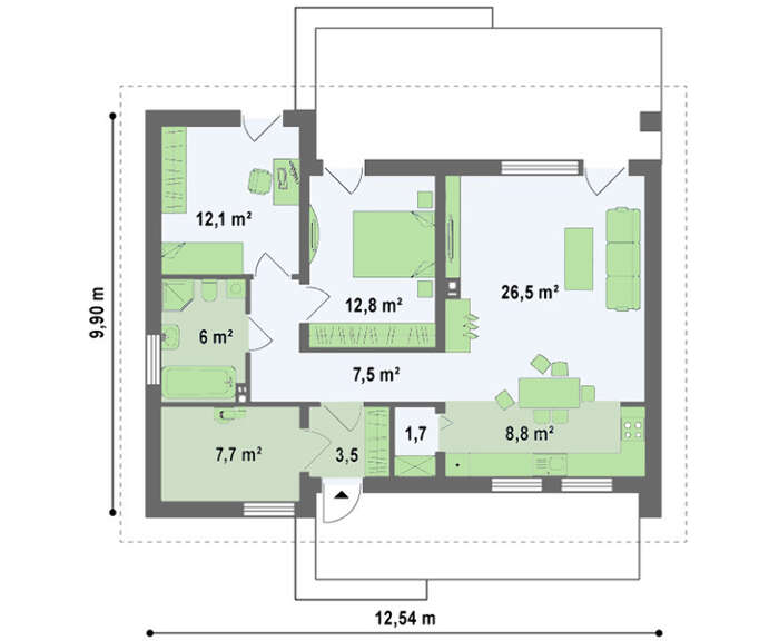 Проект содержит три раздела – Архитектурный, Конструктивный и Инженерный: водоснабжение, отопление, вентиляция, канализация, электроснабжение (приобретается за дополнительную плату) + Пояснительная записка.