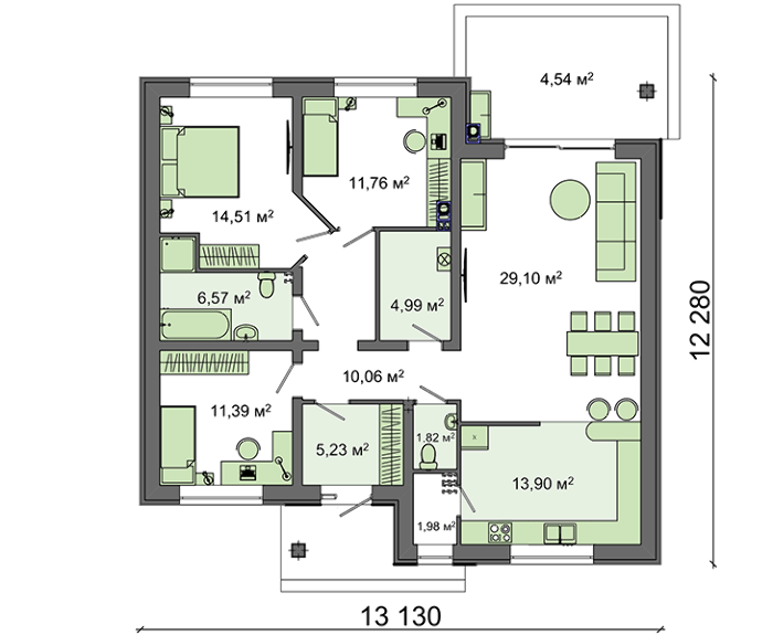 Проект содержит три раздела – Архитектурный, Конструктивный и Инженерный: водоснабжение, отопление, вентиляция, канализация, электроснабжение (приобретается за дополнительную плату) + Пояснительная записка.