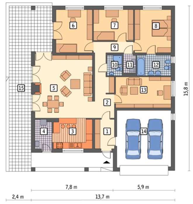 • 4M6323 Проект одноэтажного дома в кирпичных тонах