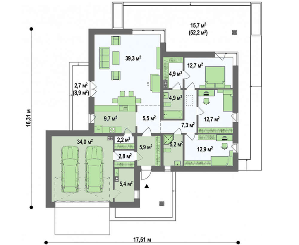 Проект одноэтажного коттеджа с гаражом для 2 авто площадью 183 кв.м. 4M7027