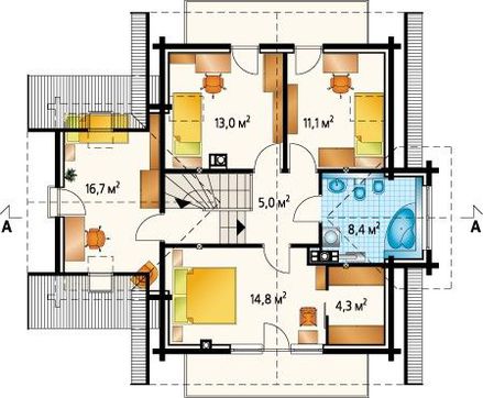 Второй этаж полностью отдан под спальные покои. Их четыре, что достаточно для большой семьи. Каждое помещение оборудовано выходом на балкон. Особо за счет планировки и расположения выделены две комнаты, большие по габаритам и с собственным балконным пространством. Их уединенное размещение помогает полноценному независимому отдыху. Дополнительное преимущество у одной из спален в большом гардеробом пространстве.