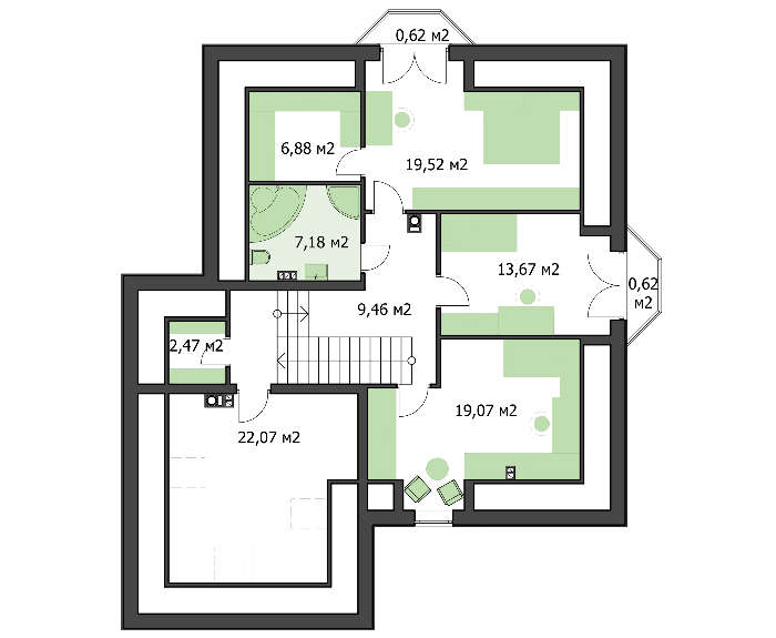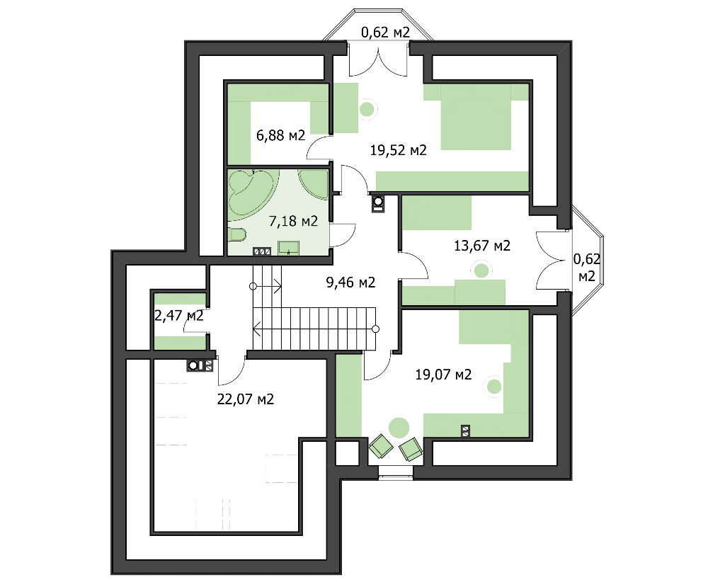 Проект содержит три раздела – Архитектурный, Конструктивный и Инженерный: водоснабжение, отопление, вентиляция, канализация, электроснабжение (приобретается за дополнительную плату) + Пояснительная записка.