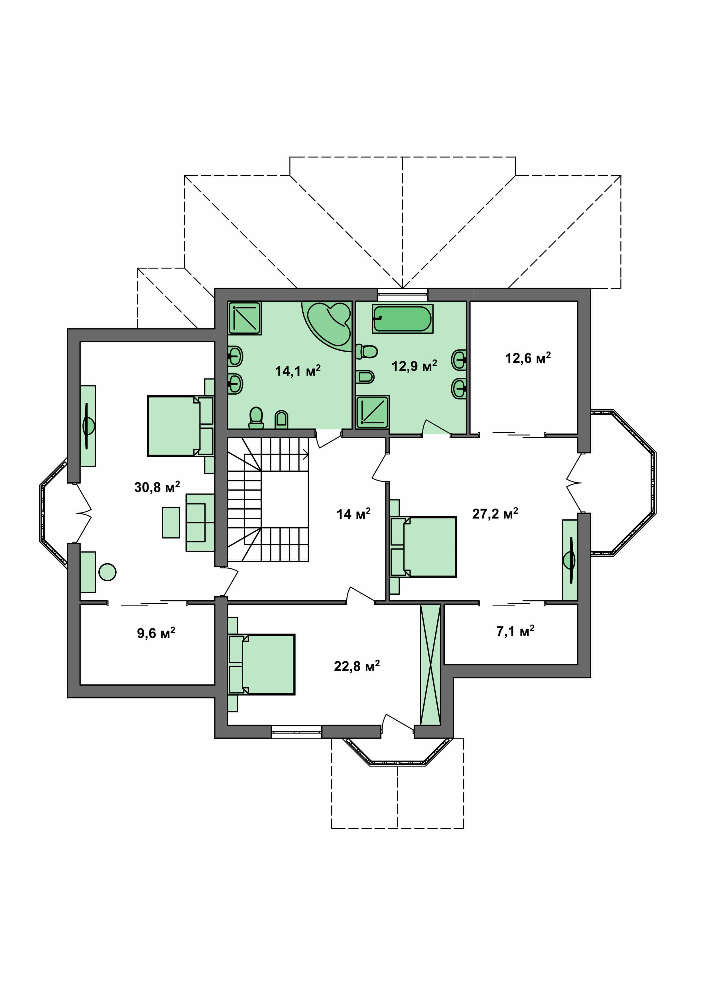 Спальных апартаментов имеется четыре. Размещенные на нижнем этаже отличают небольшие размеры, но их расположенность удобна для старшего поколения и делает их пребывание максимально комфортным. Среди спален второго этажа есть двух и трехкомнатная, последняя наделена собственным санузлом, что поднимает ее уровень комфорта до наибольших высот. Романтикам и мечтателям понравятся личные балконы, предусмотренные в каждом помещении.